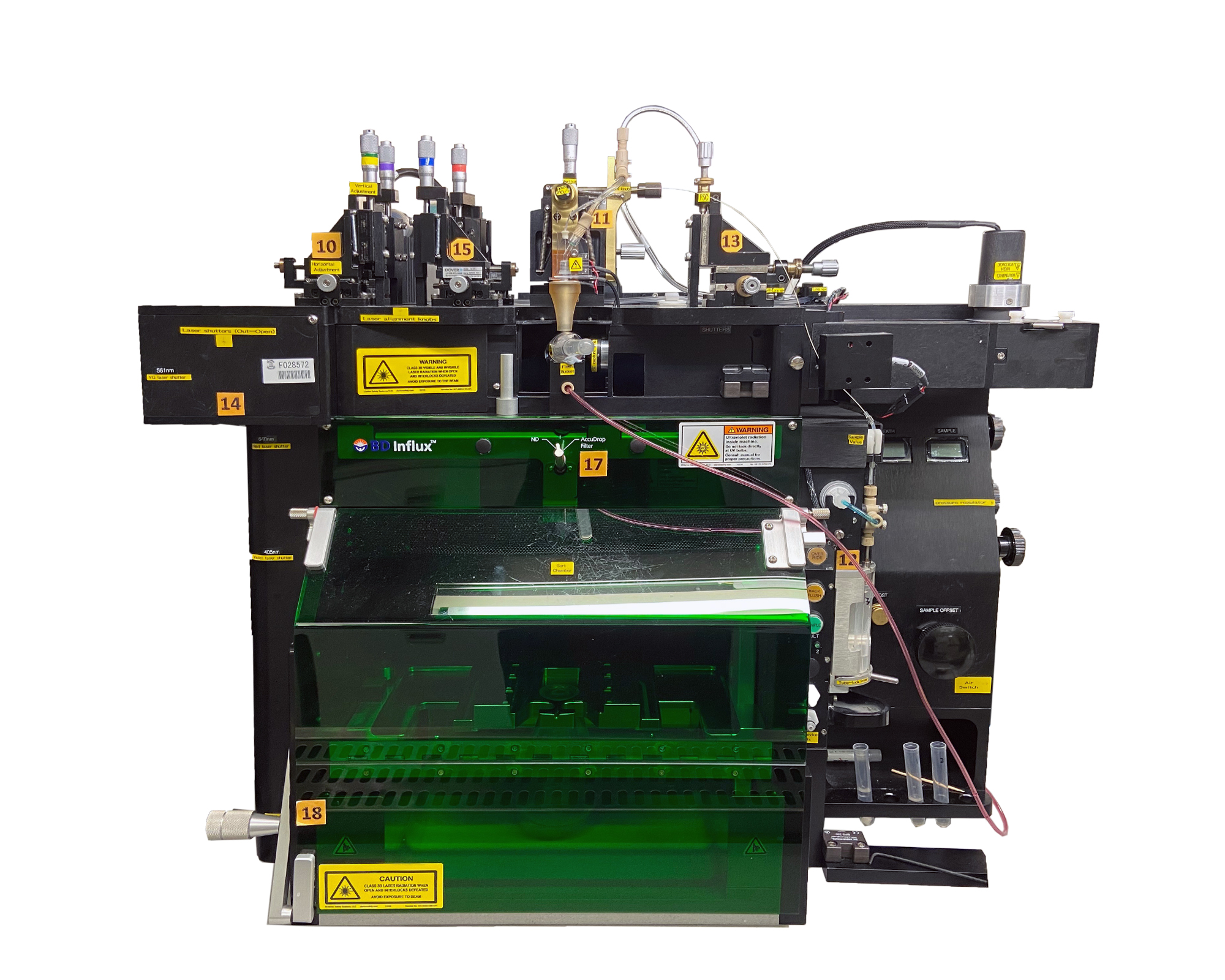 The BD Influx™ cell sorter is a 14-colour high speed cell sorter with four lasers (Violet 405nm, Blue 488nm, Yellow-Green 561nm and Red 640nm), an adjustable optical alignment and a pressure-driven fluidics system. It is a jet-in-air system and the nozzle assembly is designed to produce high droplet frequencies at relatively low pressures. This allows high-speed sorting while maintaining cell viability and functionality.