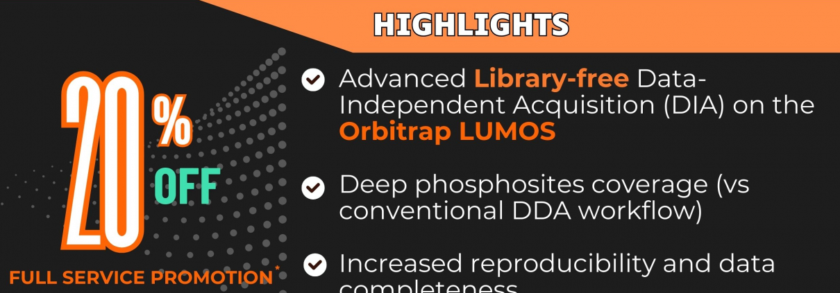 - Advanced library-free Data-Independent Acquisition (DIA) method for phosphoproteomics quantification on the Orbitrap MS platform using cell lysate. Customized options for other sample types available.