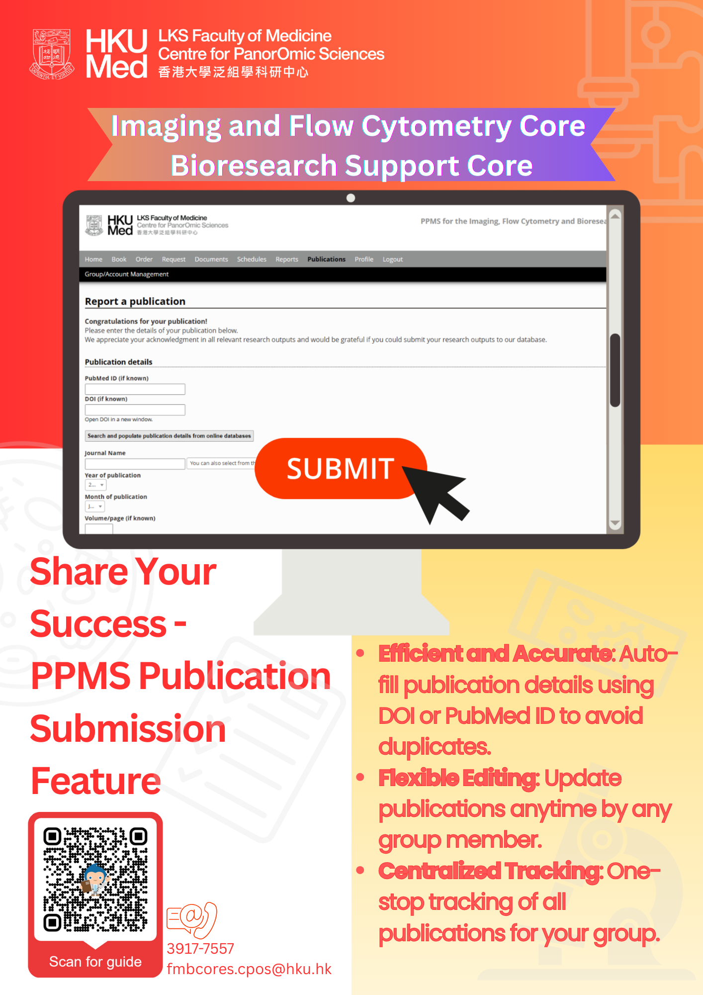 We are pleased to introduce the PPMS Publication Submission function – making it easy to submit your published outputs involving the use of CPOS Imaging and Flow Cytometry core and/or Bioresearch Support Core instruments!