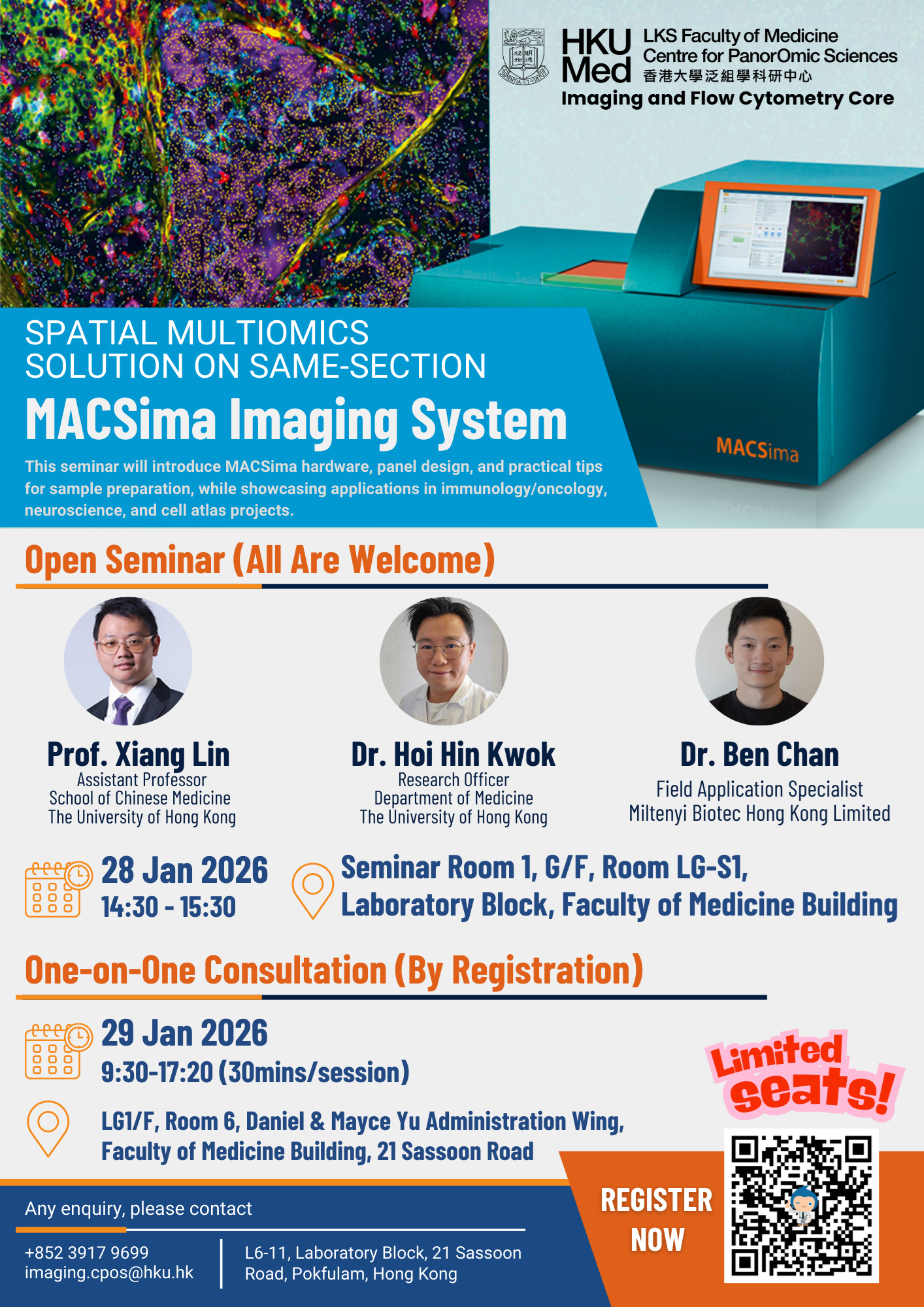 Join Our MACSima Spatial Multiomics Seminar & 1-1 Consultation – Limited Seats! This seminar will showcase spatial applications in immunology/oncology, neuroscience, and cell atlas projects, while introducing MACSima hardware, panel design, and practical tips for sample preparation. Only 10 FREE consultation sessions available – first come, first served! Get expert advice on experiment design and multiplex imaging from Miltenyi Application Specialist and CPOS Imaging Staff.