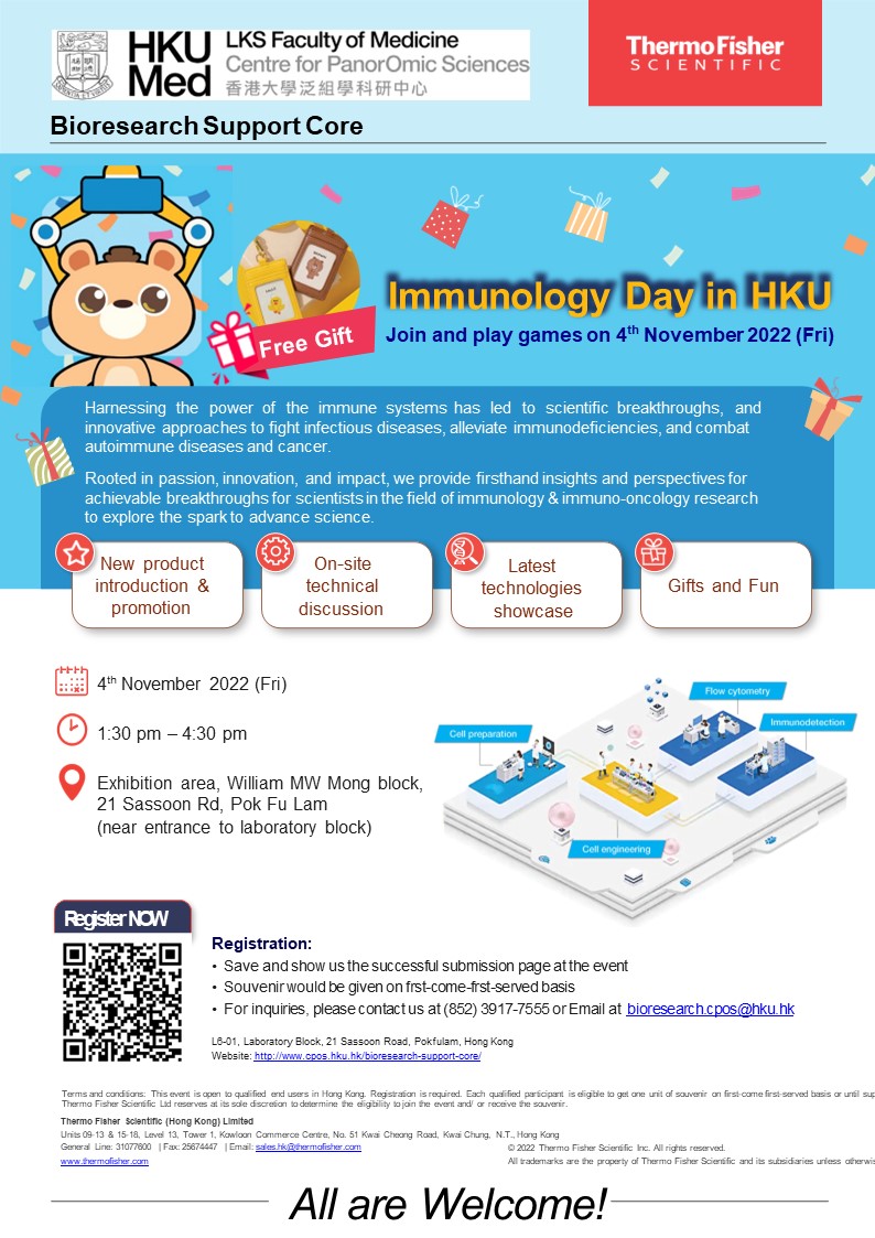 Join the Immunology Day in HKU for more information on the latest technology showcases and on-site technical discussion on how to improve your research. Explore the breakthroughs with the power of immunology to combat various diseases.